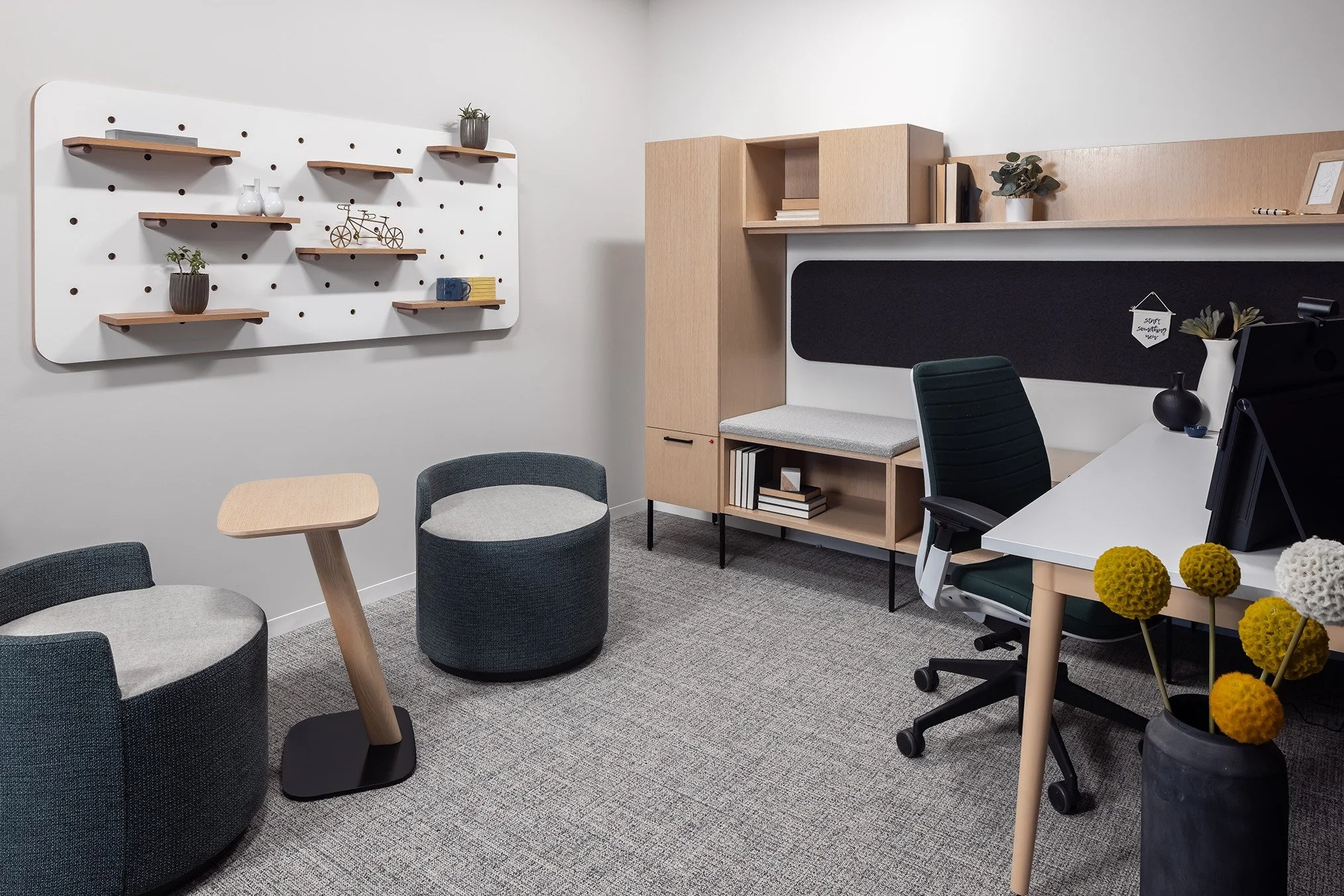 Reservable private offices and enclosed spaces offer individuals a private retreat for focus work, or small group meeting. Teams meet in the open spaces.